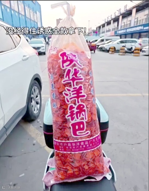 2025年十月底,一位网红将一包比自行车头还长的锅巴,绑在自行车后座上,并且配图“全款拿下”的文案走红网络。随后,西安鄠邑区的华洋锅巴厂门口就排起了长队,顾客们从西安市或者周边地区开车过来购买35元一袋的陕华洋锅巴。