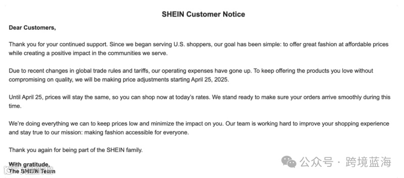 “全球贸易规则变化导致运营成本增加,不得不调整价格以维持质量。”——SHEIN在其官网公告中坦言。