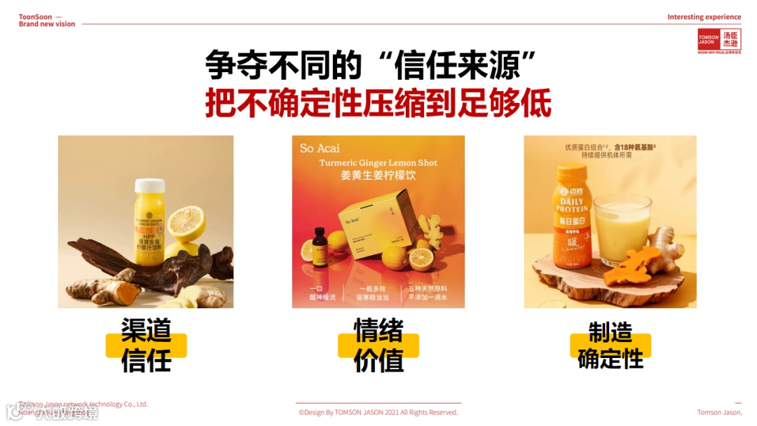 在渠道霸权和DTC制衡下,功能性饮料或保健品品牌于姜黄饮这个赛道则通过制造消费确定性,争夺对功能补给有明确期待的人群。