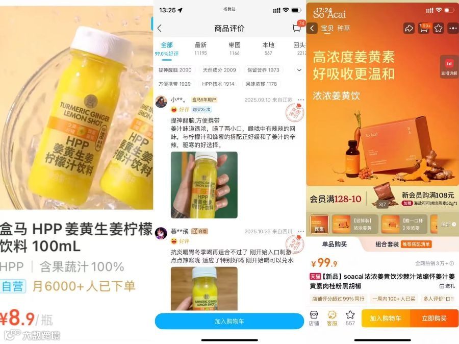 山姆、盒马的姜黄饮料时常处于售空补货的状态。盒马App页面显示,姜黄饮评价1万+,好评率高达99%。