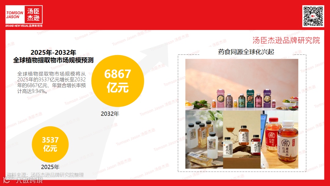 这股高涨的需求,正强力推动着食品饮料对天然植物提取物的广泛应用。据WENKH研究报告预测,全球植物提取物市场规模将从2025年的3537亿元增长至2032年的6867亿元,年复合增长率预计高达9.94%。