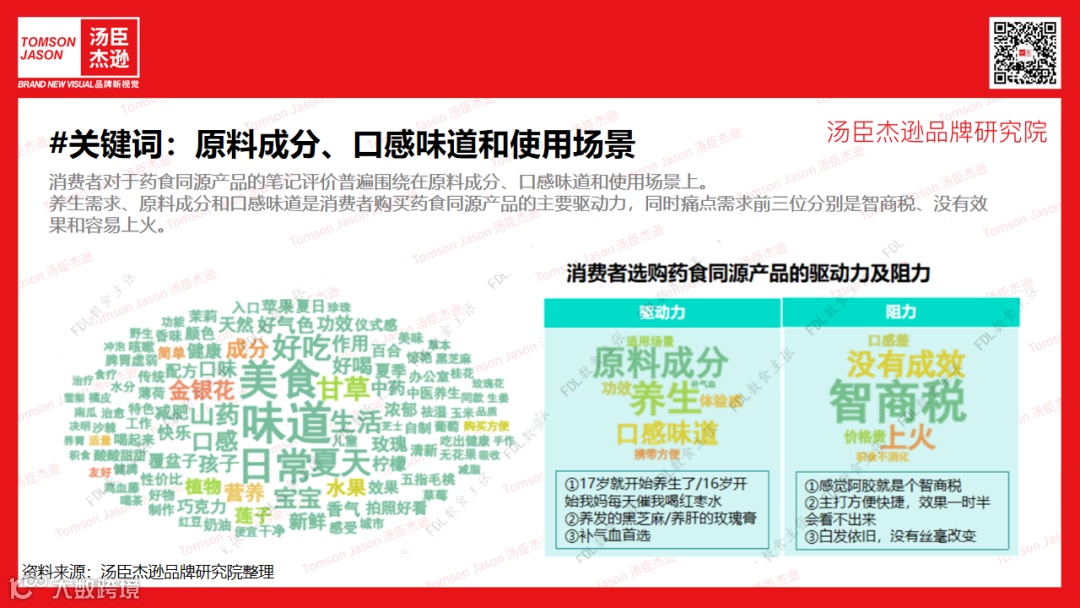 养生需求、原料成分和口感味道是消费者购买药食同源产品的主要驱动力,同时痛点需求前三位分别是智商税、没有效果和容易上火。