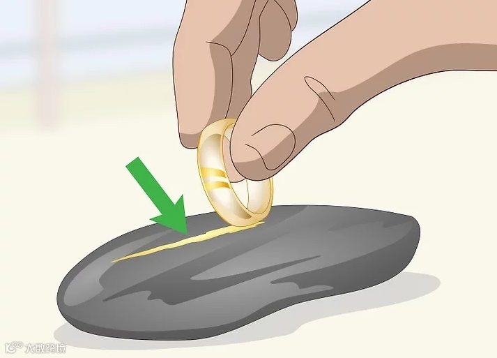 用未上釉陶瓷板刮擦首饰表面。若留下黑色或灰色划痕,说明材质较硬,不含金或为镀金;真金质地软,划后应留金黄色痕迹。