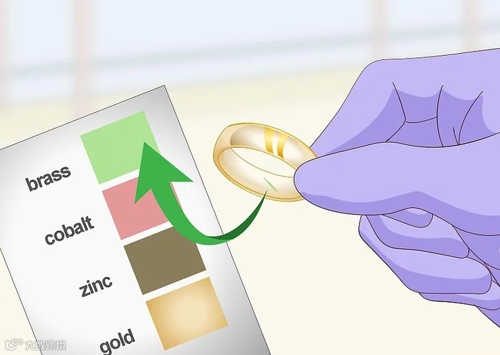 在手背涂抹一层干透的液体粉底,再用首饰在其表面反复摩擦。纯金因摩擦会产生类似铅笔的黑色痕迹,这是其与化妆品中成分反应的结果,可作为辅助鉴别手段。