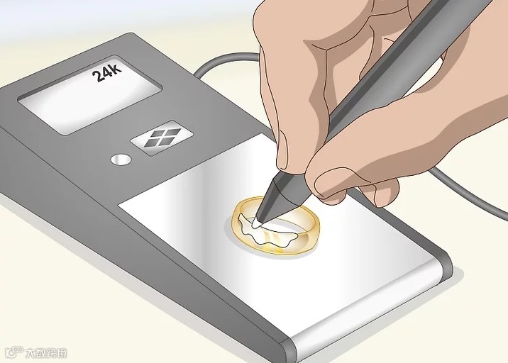 电子检测仪通过测量导电性判断含金量。使用前需涂抹导电胶以确保接触良好。纯金导电性强,仪器读数显著高于其他金属,操作简便且无损检测。