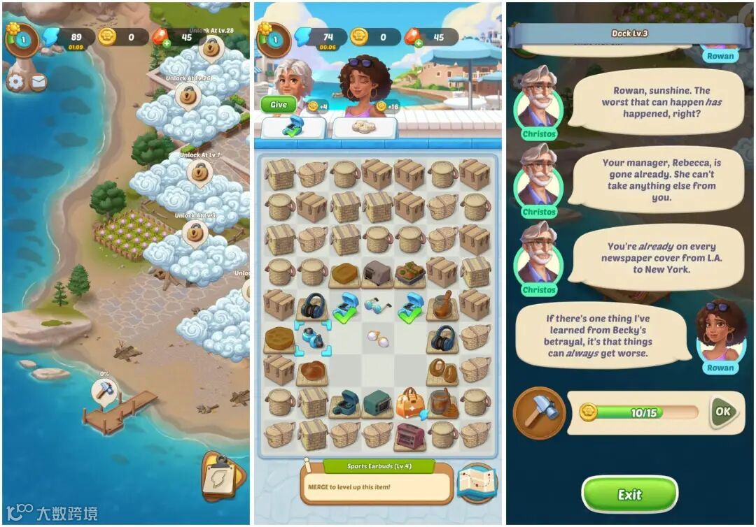 在这两款游戏中,玩家扮演的女主遭遇到生活或工作上的背叛与打击,选择回到家乡疗伤,为了生计开始重建餐厅或小镇。玩家需要消耗体力合成指定的物品获得金币,花费金币就能完成装修工作和解锁剧情。凭借悬疑、逆袭剧情,爽快合成及自由装修玩法,这两款产品推动了二合品类快速发展。