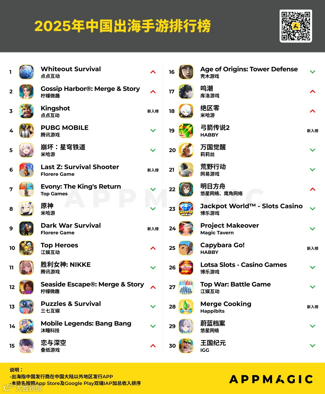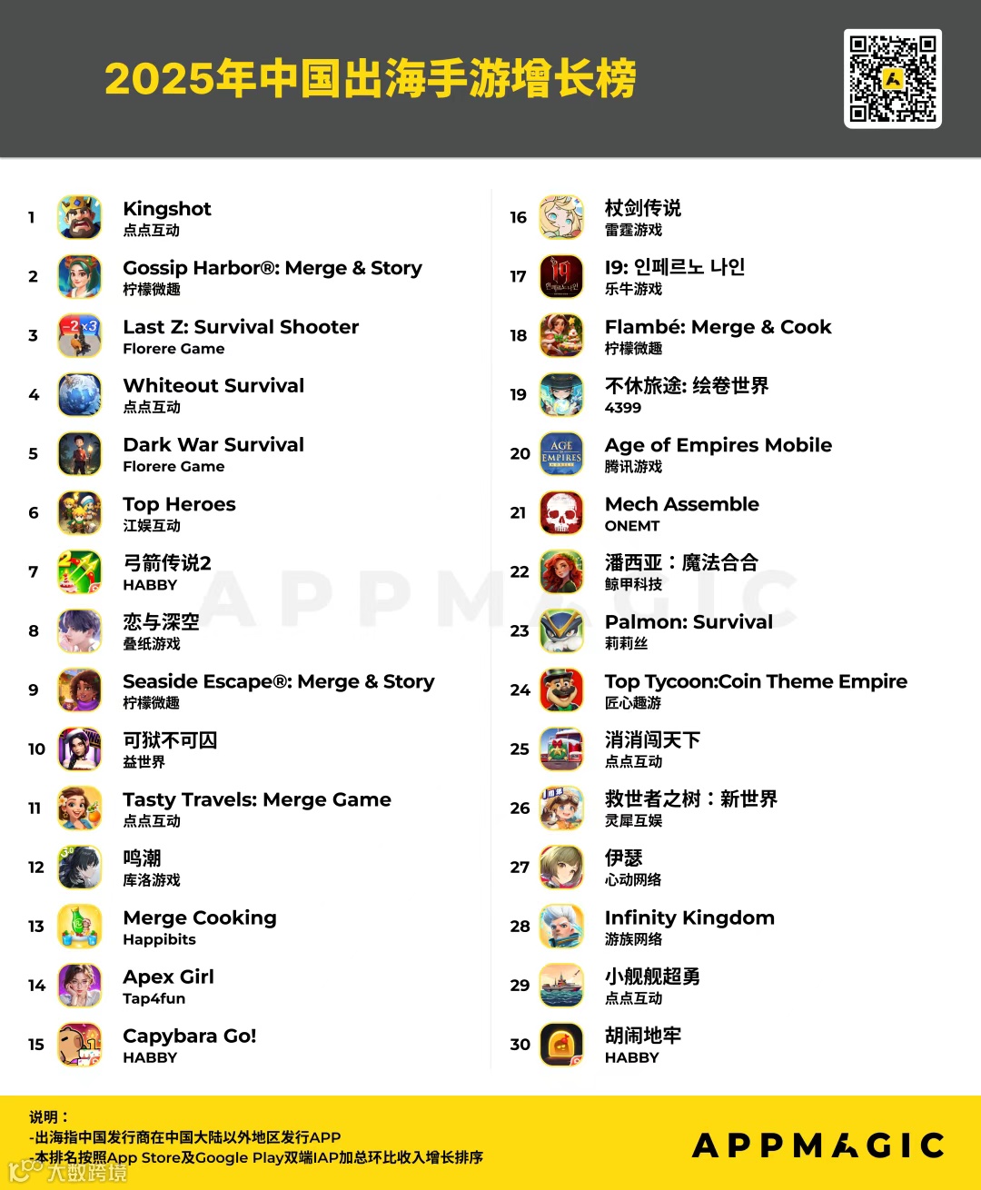 最近,移动应用市场研究机构AppMagic公布了2025年中国出海手游收入榜。(注:本排名按照App Store及Google Play双端IAP加总收入排序,不包括中国地区iOS及第三方安卓渠道收入,并且已刨除平台分成)