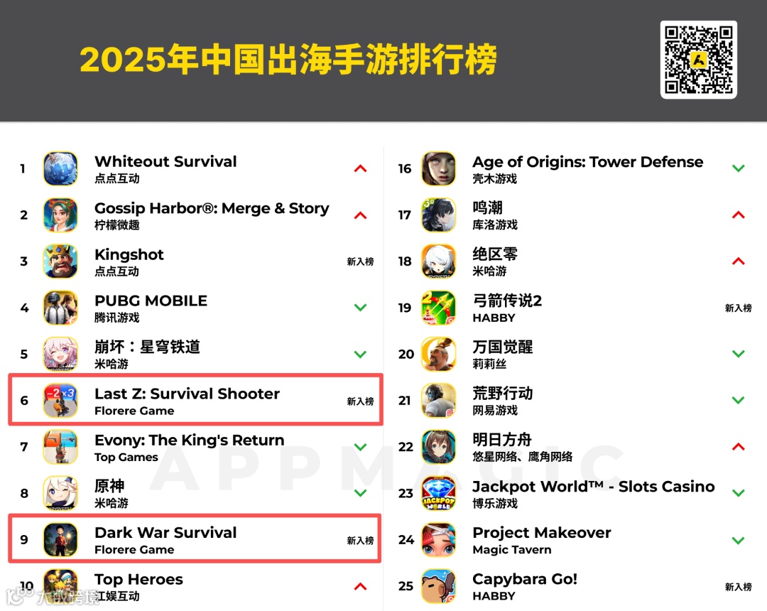 Florere Game旗下4X策略游戏《Last Z: Survival Shooter》首次入围年度出海收入TOP30,位列第6名。