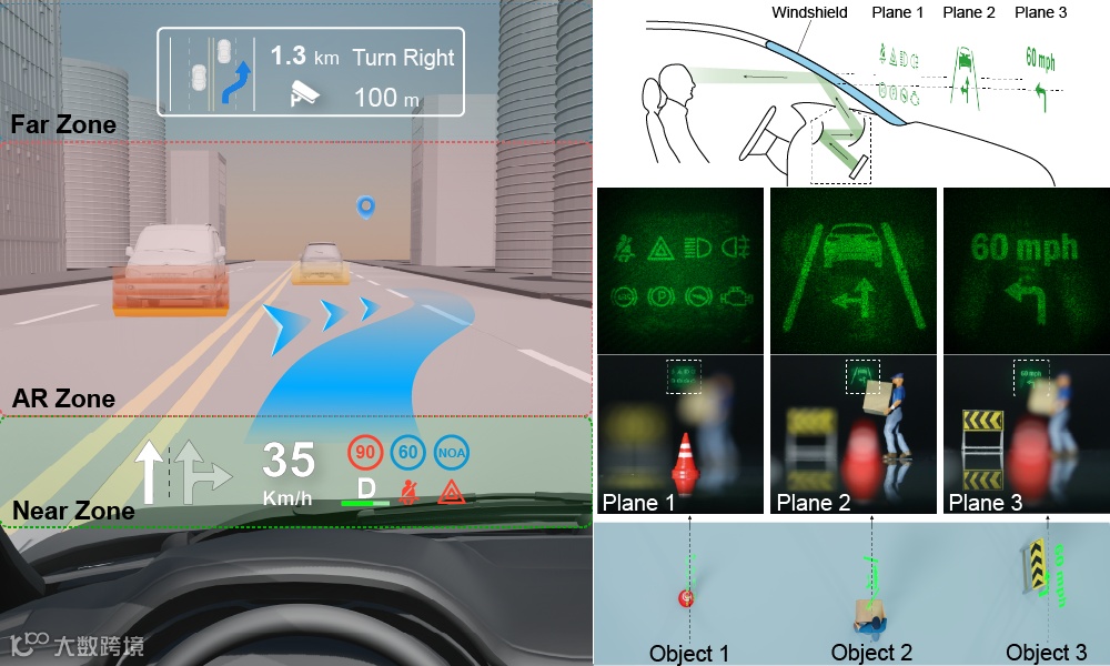 此外,团队还构建了一个多平面全息HUD原型系统作为应用验证。该系统利用单个空间光调制器,成功在距离“挡风玻璃”0.1米、0.5米和1.5米处,分别投射了清晰的虚拟图像。