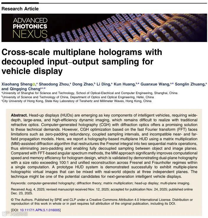 近日,上海理工大学程庆庆教授团队与中国科学技术大学黄坤教授团队合作,提出了一种基于非方阵矩阵乘法(Matrix Multiplication, MM)的衍射计算新方法。该研究通过算法底层的创新,有效解决了传统方法中的采样耦合与计算冗余问题,并在车载抬头显示(HUD)原型机中成功验证了其跨尺度、多平面的成像能力。该成果以 "Cross-Scale Multi-Plane Holograms with Decoupled Input-output Sampling for Vehicle Display" 为题,发表于光子学期刊Advanced Photonics Nexus。