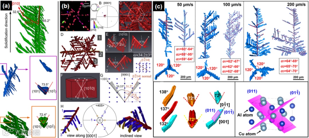 晶体生长是金属凝固过程的核心环节,直接决定了材料的最终组织与性能。近年来,借助同步辐射成像技术,系统揭示了枝晶生长的动力学细节与外场调控机理,清晰呈现了共晶组织复杂的三维生长与粗化行为,并精确解析了金属间化合物的形态转变机制与晶体学特征(图2),相关结果为完善凝固理论、实现凝固组织主动调控提供了关键依据。