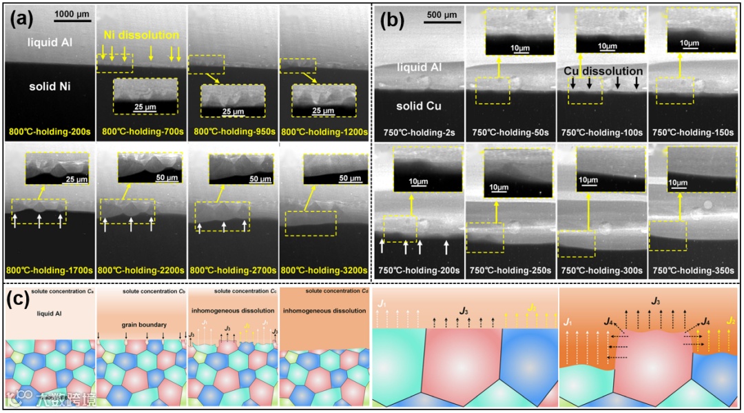 图3 不同异质界面的形状演变与高熔点基材的非均质溶解示意图。(a)Al/Ni界面;(b)Al/Cu界面;(c)高熔点基材的非均质溶解