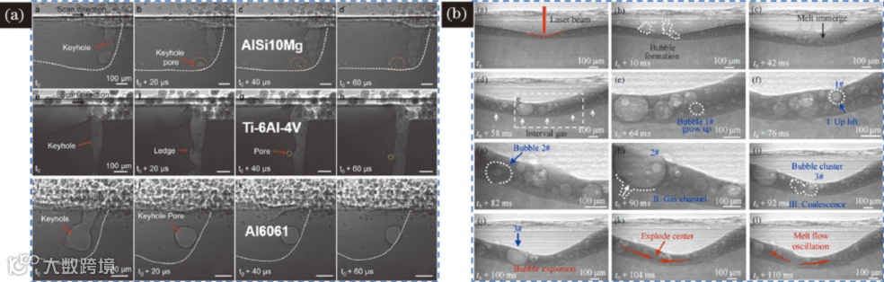 图5 激光粉末床熔融过程中气孔演化。(a)金属合金粉激光粉末床熔融过程中气孔的形成与演变;(b)氧化物粉末激光粉末床熔融过程中熔池中气泡的形成、生长、运动和演变