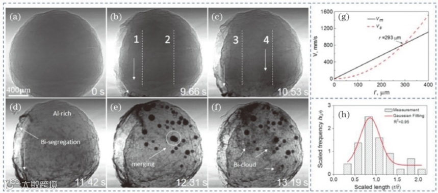 图4 Bi 质量分数为10% 的Al-Bi 合金中溶质偏析及液相分离行为。(a)~(f) Al-Bi 合金熔体降温过程中的同步辐射原位全景图;(g) Marangoni 和Stokes 运动速率随Bi 液滴半径的变化曲线;(h)Bi 液滴的约化尺寸分布