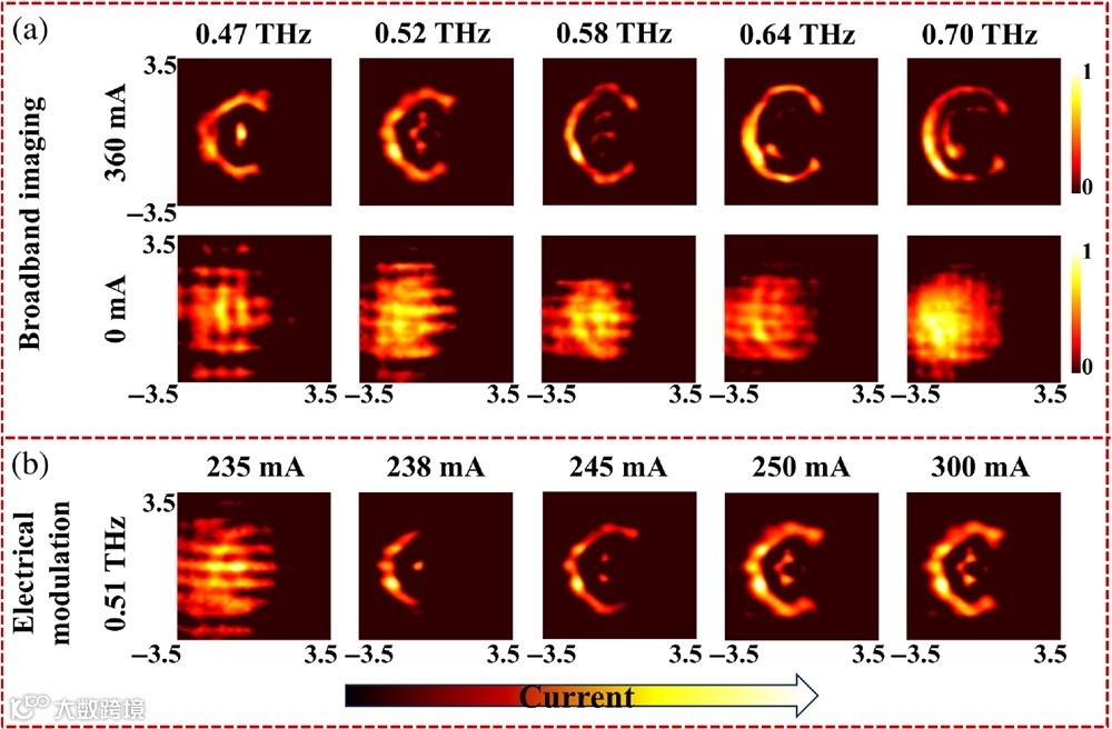 研究团队进一步探讨了基于“梯形”设计的太赫兹电调控全息加密技术的工作带宽。实验结果表明,在0.47至0.7 THz频段内,0 mA和360 mA偏置电流下,电调控的全息图像和加密图像能够清晰区分(见图4a)。随着偏置电流的变化,加密图像和全息图像呈现明显的传输差异,且在不同电流下,图像能够实现实时调制。实验还表明,当偏置电流达到250 mA时,系统能够完成从加密到解密的全过程,证明250 mA是该全息加密系统的阈值电流,展示出了比现有太赫兹设备更低的功耗(图4b)。