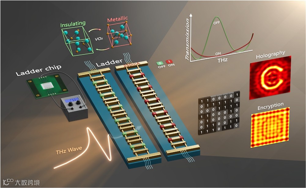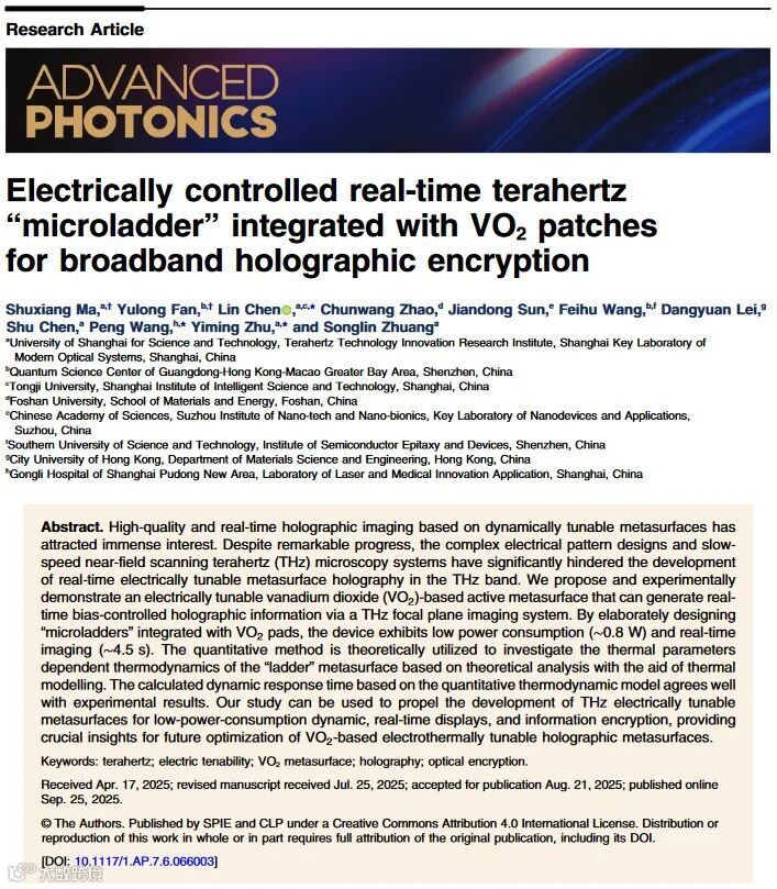 针对上述挑战,上海理工大学的庄松林院士团队联合香港城市大学,粤港澳大湾区量子信息中心,苏州纳米所等单位提出了一种创新的“梯形”设计VO2集成电控超表面。通过在电极与阶梯之间嵌入VO2,该超表面能够在0.47至0.7 THz频段内实现电调谐的全息成像。与传统的热调节方式相比,这一电控设计突破了响应速度和实时性的限制,实现了实时全息图像的生成。这一创新方案不仅为太赫兹设备在加密和成像方面提供了新的思路,还展示了其在高安全性、快速响应领域的广阔应用前景。相关成果以Electrically controlled real-time terahertz “microladder” integrated with VO2 patches for broadband holographic encryption为题,发表在Advanced Photonics 2025年6期。