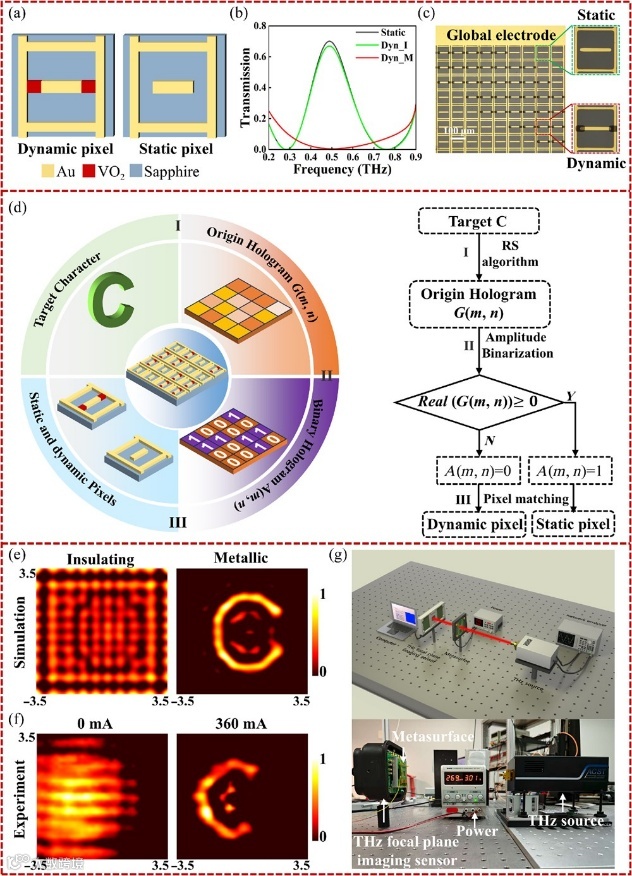 为实现全息成像和加密功能,研究团队提出了两种类型的“梯形”设计:静态像素和动态像素,这两种设计能够通过偏置电流实现全息图像的实时切换(图3a)。实验结果显示,在绝缘态和金属态下,静态像素保持恒定的高传输,而动态像素能够在偏置电流变化时从“开”到“关”状态切换,从而实现信息的编码(图3b)。研究团队采用二进制幅度全息算法将目标图像编码为全息图,并成功重建了字符“C”(图3e)。随着偏置电流从0到360 mA的增加,研究人员能够完成完整的加密和解密过程,验证了“梯形”设计的可行性(图3f)。此外,太赫兹焦平面成像系统的应用展示了该技术在实时太赫兹全息成像和加密中的巨大潜力(图3g)。