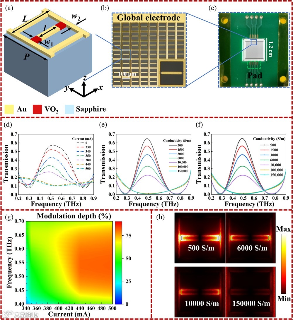 该超表面采用500 μm厚的c-cut蓝宝石基板,结合“梯形”设计(图2a)。VO2补丁被布置在梯形扶手和梯级之间(图2b),通过PCB芯片(图2c)控制电流流动,从而触发VO2的金属-绝缘体转变,调节太赫兹波的传输幅度。