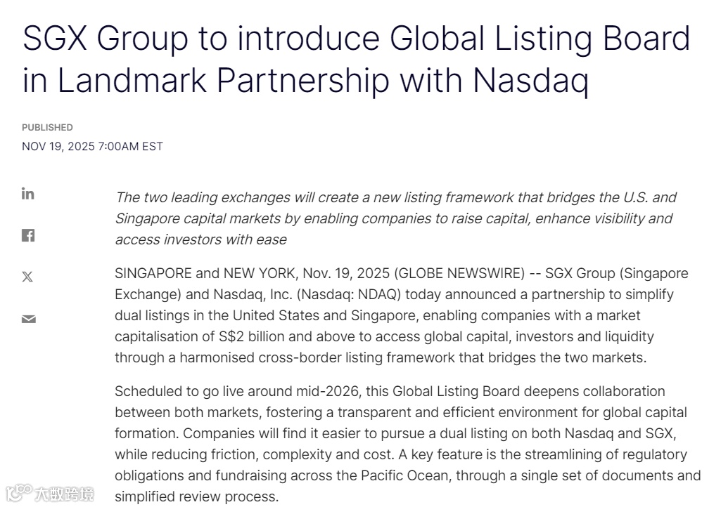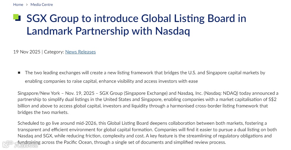 2025年11月19日,新加坡交易所(SGX)与纳斯达克(Nasdaq)联合官宣建立战略合作伙伴关系,计划于2026年年中推出“全球上市板”(Global Listing Board)。这一创新机制以“一套文件、两地挂牌”为核心,打破了跨太平洋上市的监管壁垒,为企业构建起连接美国资本深度与亚洲增长红利的全新通道,标志着全球资本市场互联互通进入实质阶段。