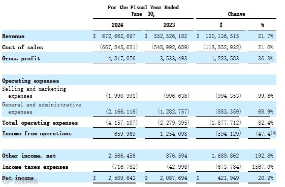 招股书显示,2023~2024财年(截至6月30日),公司实现收入5.525亿美元、6.726亿美元,相应的净利润分别为208.7万美元、250.9万美元