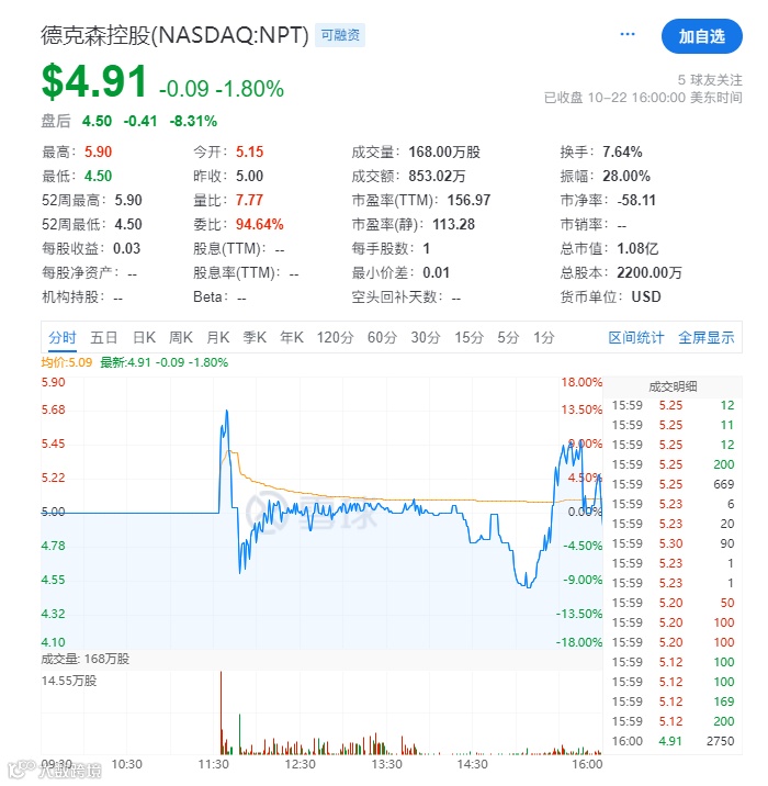 2025年10月22日,浙江网塑科技控股实体 Texxon Holding Limited(德克森控股)以股票代码 “NPT” 正式登陆纳斯达克资本市场,该公司此次以每股5.00美元的价格发行了190万股,募资950万美元。公司于2024年3月26日在美国SEC秘密递表,并于2025年1月14日获中国证监会境外上市备案通知书。首日开盘股价为5.15美元,股价当日最高触及5.9美元,最终收于4.91美元,总市值1.08亿美元。