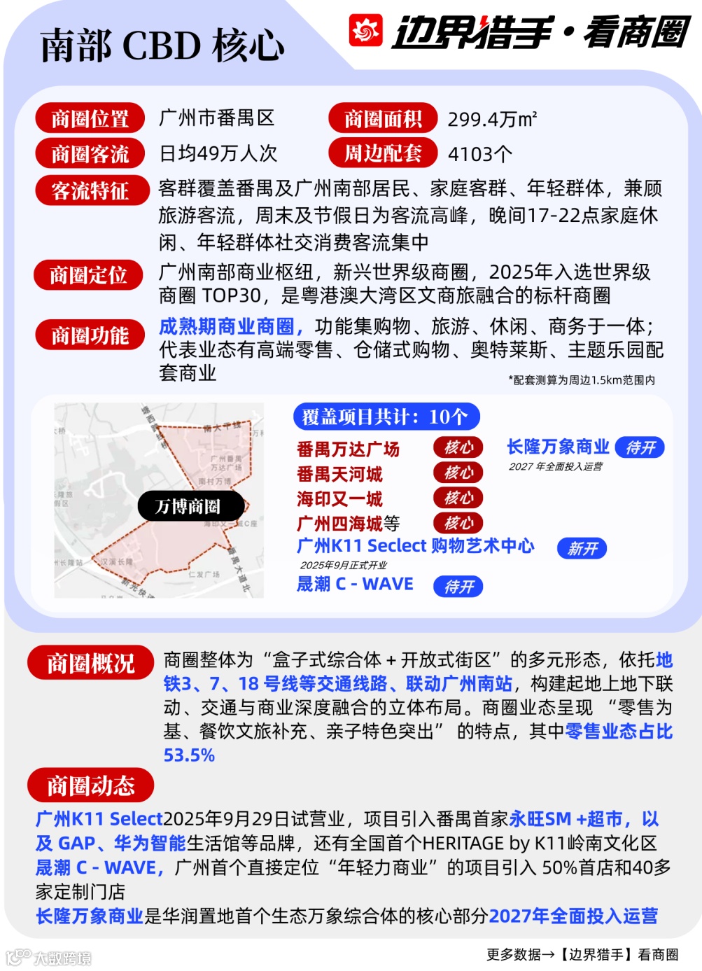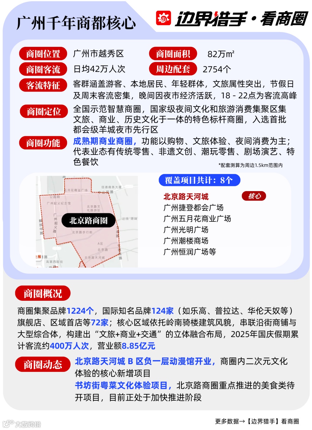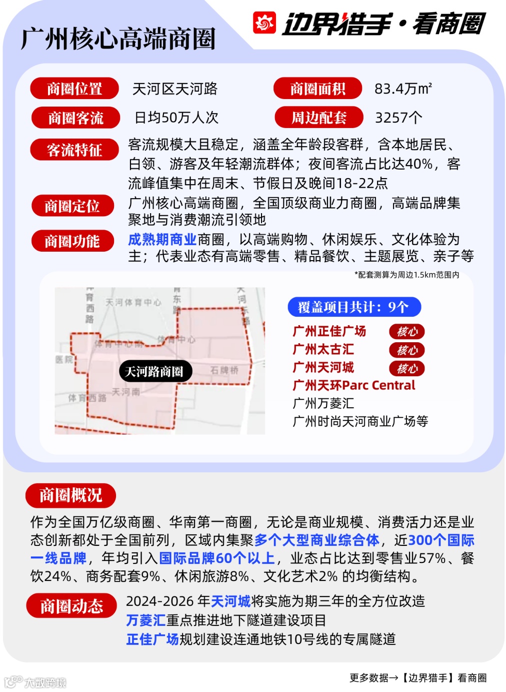 边界猎手着眼广州核心板块,筛选出9大特色商圈进行深度解构,从核心数据、地标项目到客群特征全维度分析,为项目方的运营策略优化、品牌方的拓店路径选择提供专业且可落地的决策依据。