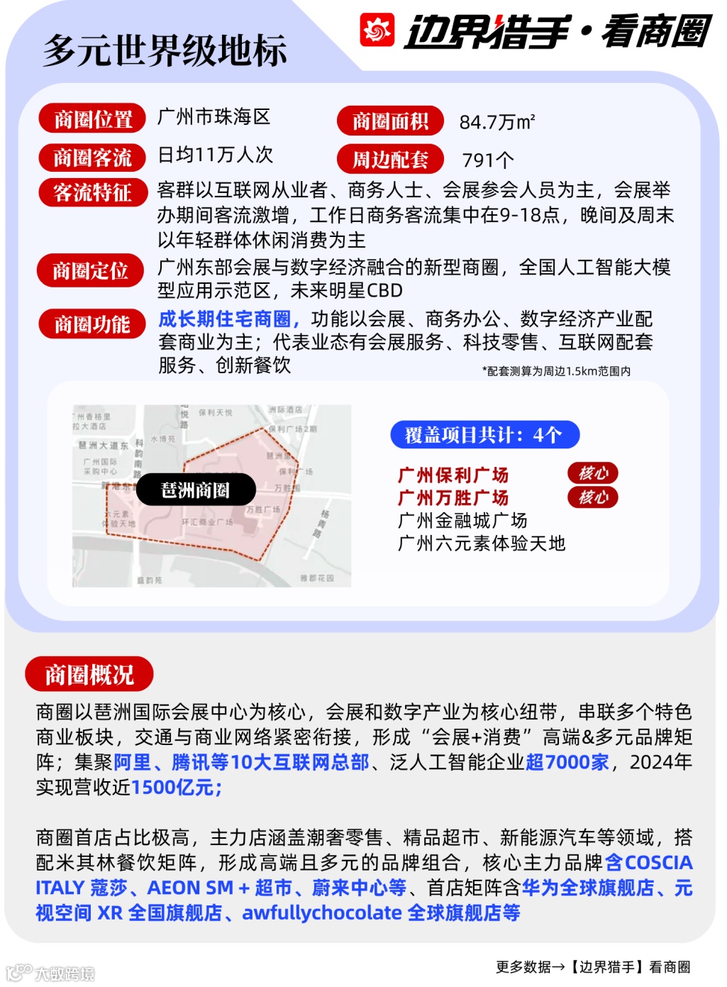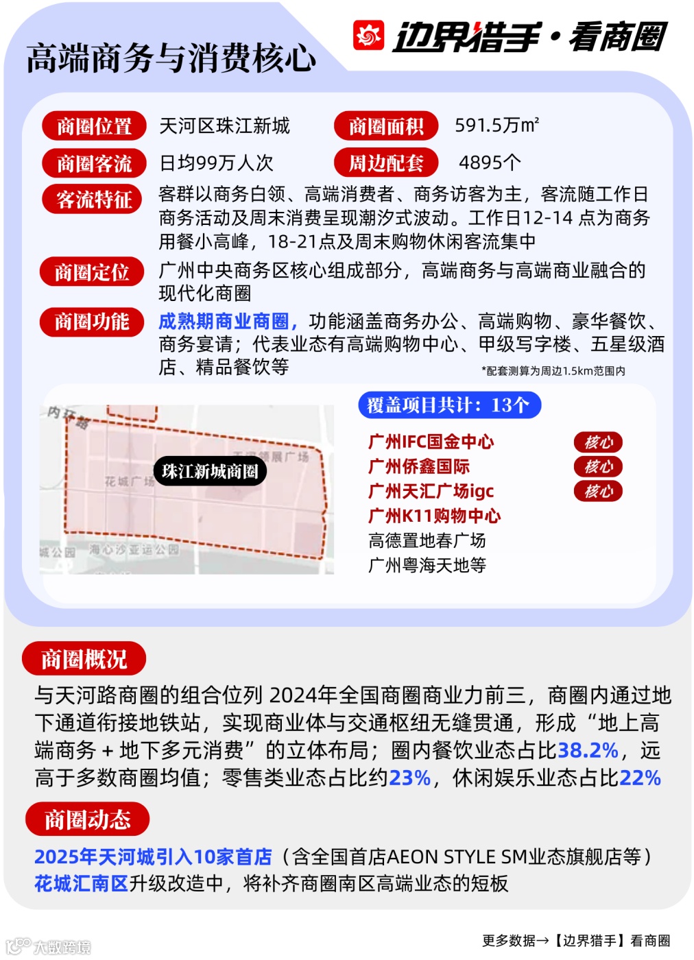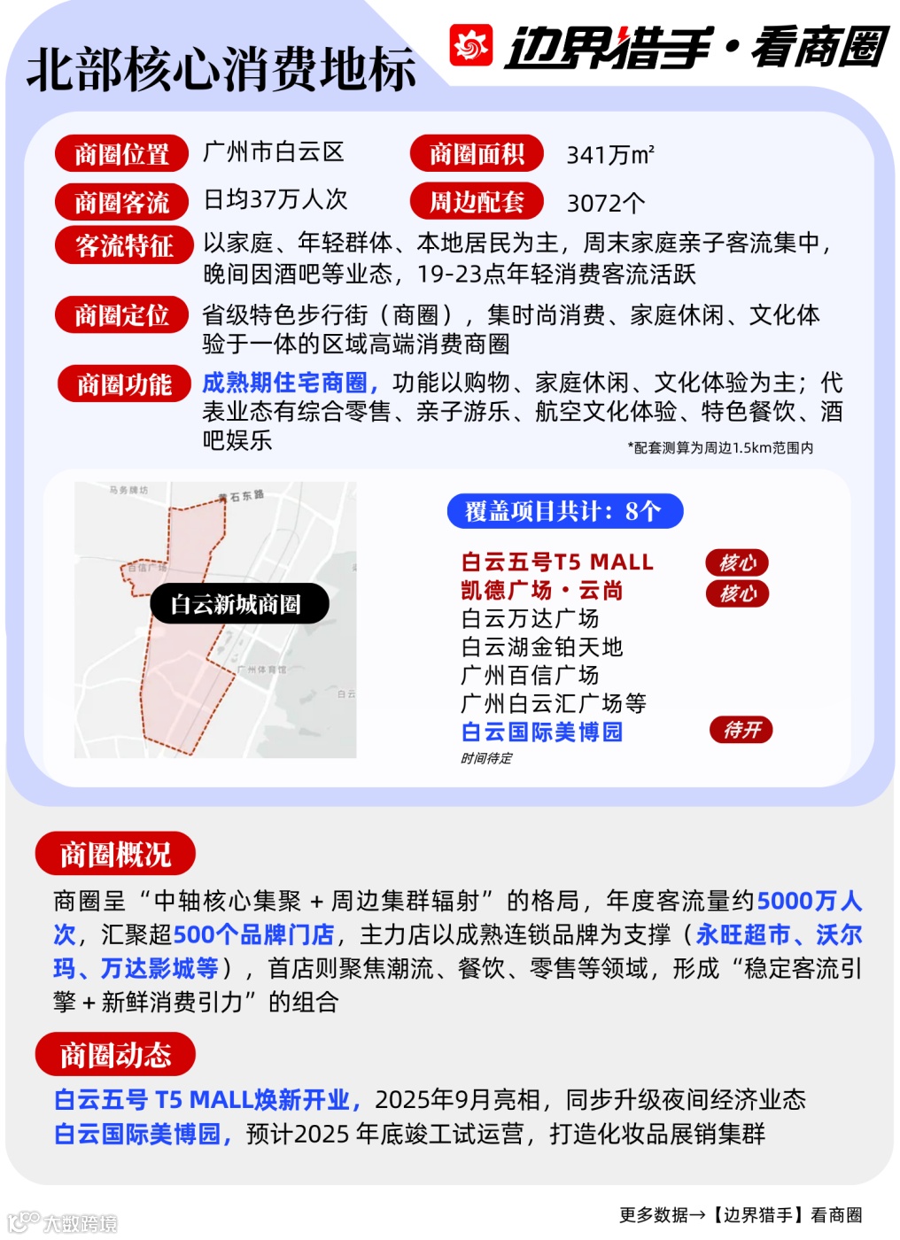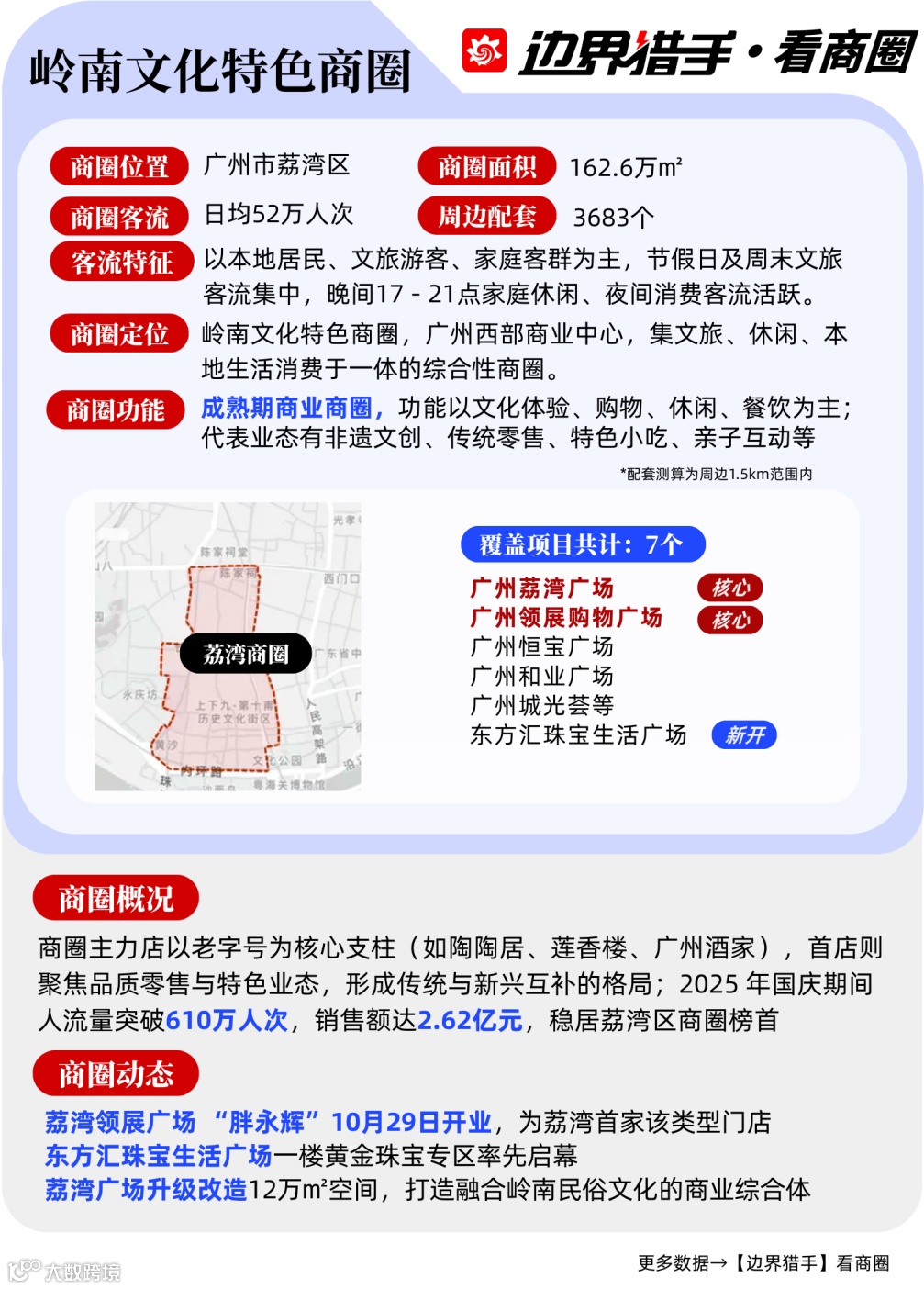 边界猎手着眼广州核心板块,筛选出9大特色商圈进行深度解构,从核心数据、地标项目到客群特征全维度分析,为项目方的运营策略优化、品牌方的拓店路径选择提供专业且可落地的决策依据。