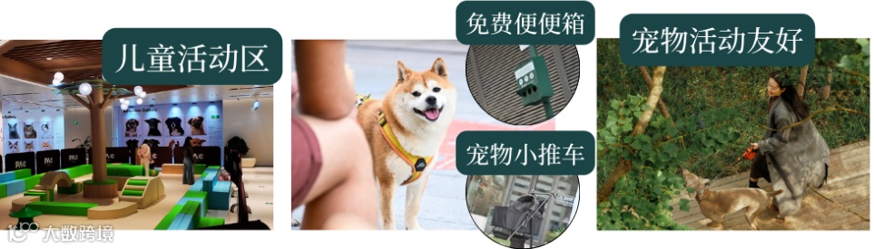 公共区域全面对宠物开放,设免费便便箱;同时设立儿童活动区,方便家庭消费者前来。