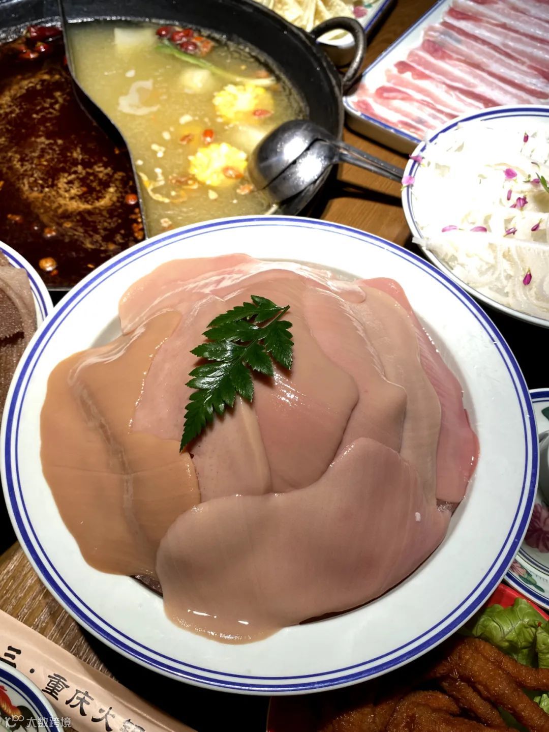 毛肚表面密布天鹅绒般细腻肉刺,还是老规矩,七上八下,口诀一到,口感正佳。片大的脆毛肚蘸上油碟趁热塞到嘴里,舌尖能感受到其略显粗糙的触感,毛肚的香气与料底巧妙融合,口感厚实有韧性,给你唇舌的满足~