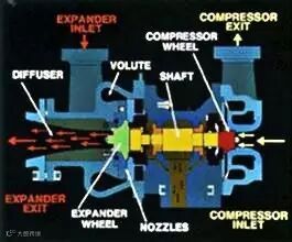膨胀机轮子的飞速转动,带动了与膨胀机轮子在同一轴上另一端的增压机叶轮的转动,增压机叶轮的转动压缩了通过增压机叶轮气体,增压机叶轮不仅压缩了气体,利用了膨胀发出的功率,而且也控制了膨胀机的转速。