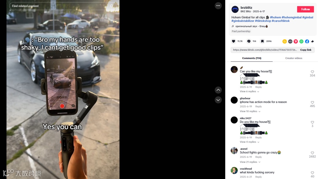 观察其品牌标签#Hohem,可以看到Hohem浩瀚积极与TikTok上的摄影爱好者、摄影博主、生活博主合作。鼓励创作者用设备分享真实作品,而非单纯展示产品,在弱化广告感的同时,更直观地呈现产品在创作中的实际效果与价值。