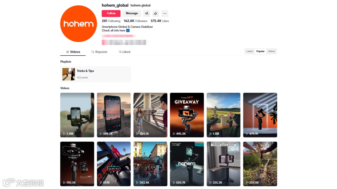 目前Hohem浩瀚在TikTok的官方账号@hohem_global已积累16.2万粉丝,发布内容主要围绕摄影创作展开,涵盖短视频拍摄技巧分享与产品功能讲解,既有通过稳定器拍出的多种新奇视角示例,也不乏与摄影达人合作的创意内容,持续强化品牌在创作者群体中的专业形象。