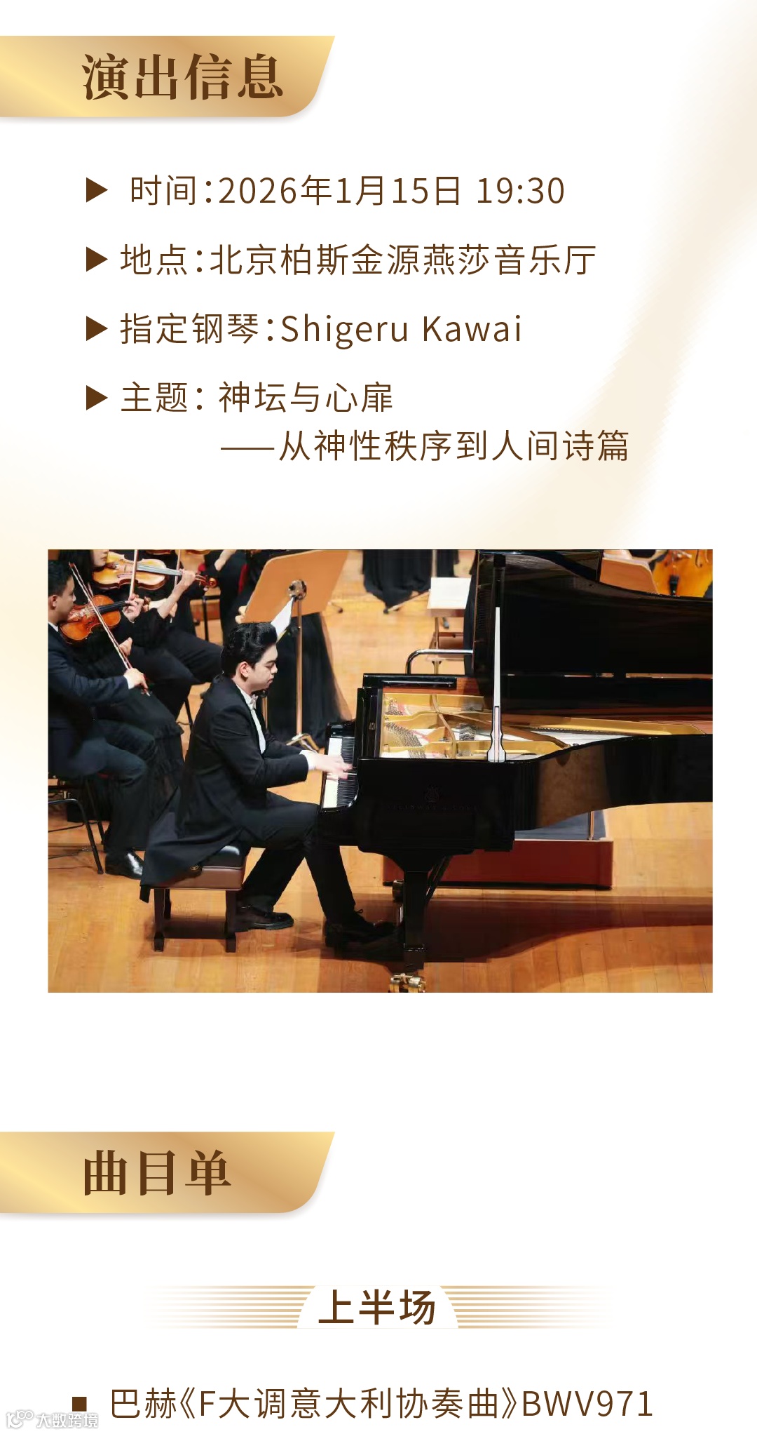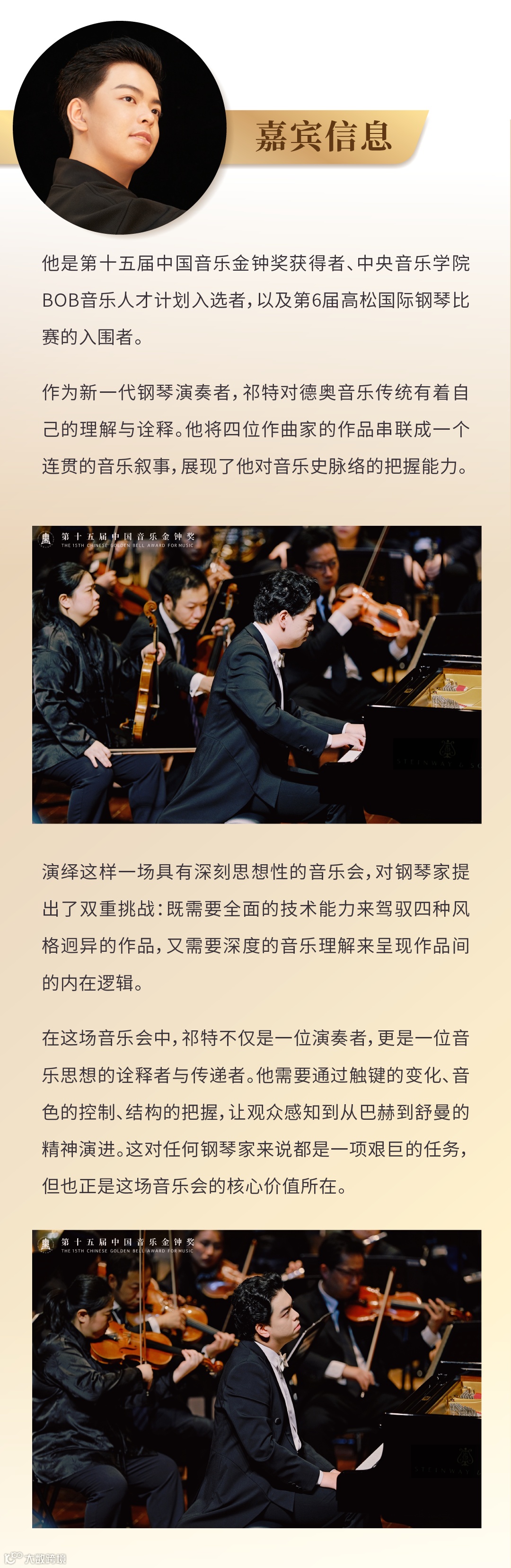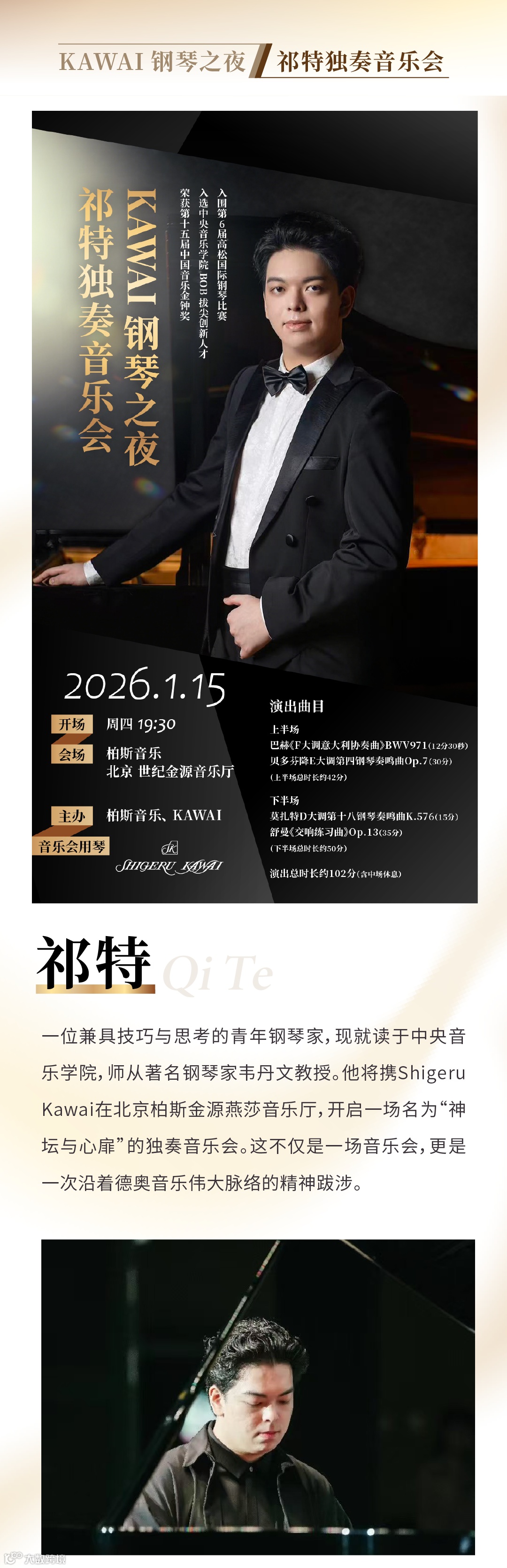 祁特,中央音乐学院BOB拔尖创新人才,长江钢琴青年艺术家,第十五届中国音乐金钟奖获得者。曾师从于中央音乐学院张晋教授,现师从于中央音乐学院韦丹文教授。