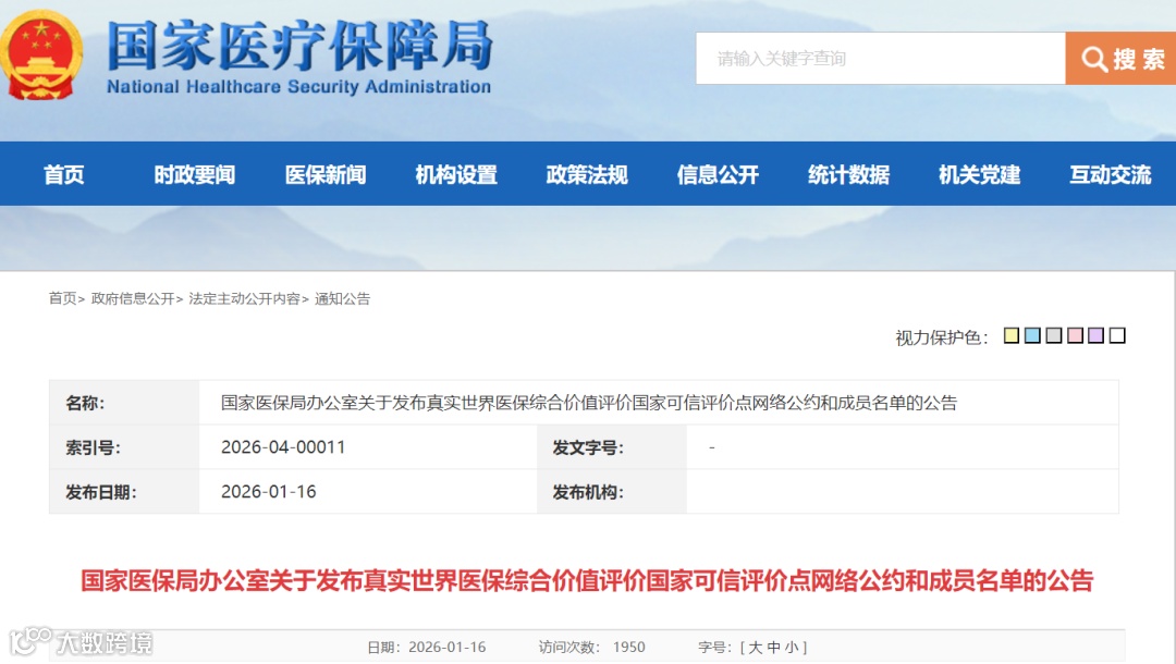 国家医保局办公室关于发布真实世界医保综合价值评价国家可信评价点网络公约和成员名单的公告