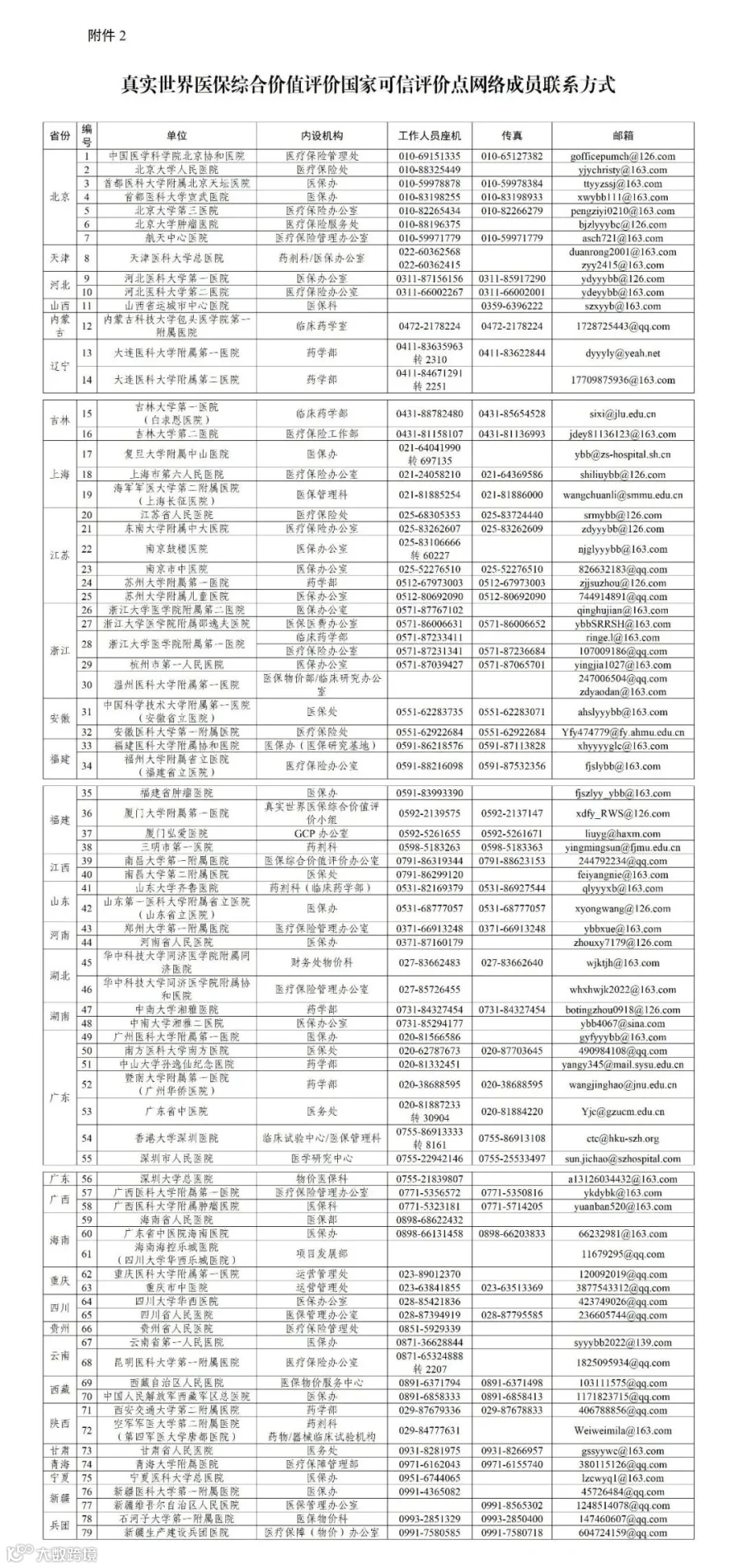 附件2:真实世界医保综合价值评价国家可信评价点网络成员联系方式
