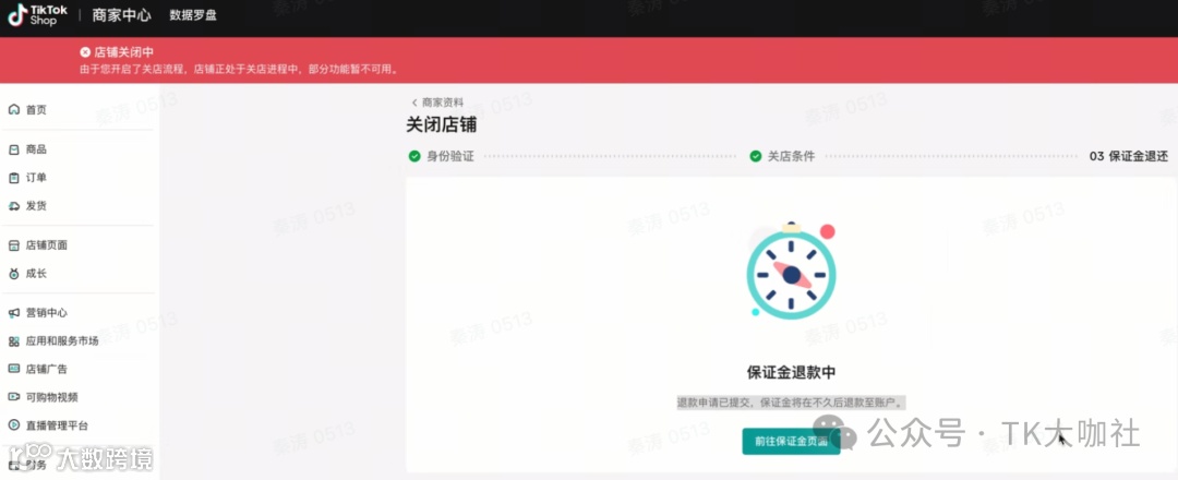 若保证金为0,可直接关店;若保证金大于0,则需跳转至保证金界面操作退款,退款预计3~5天完成。