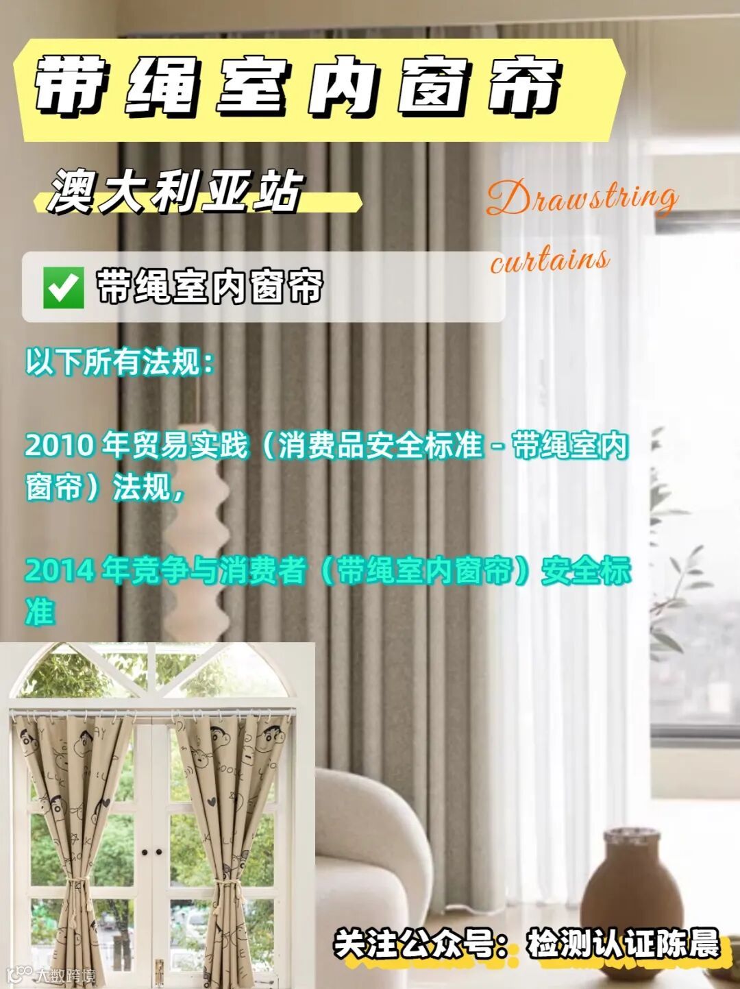 需符合以下全部法规: · 2010 年贸易实践(消费品安全标准 - 带绳室内窗帘)法规 · 2014 年竞争与消费者(带绳室内窗帘)安全标准 |