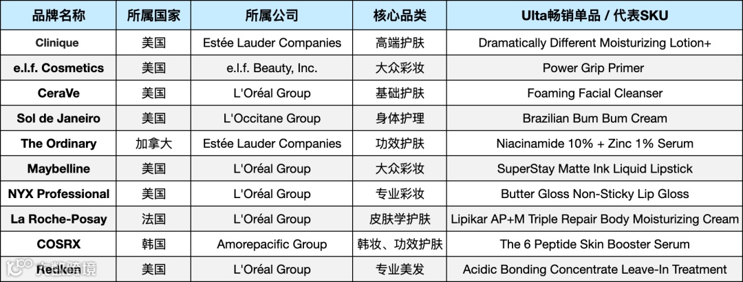 Ulta畅销品牌在护肤、彩妆、护发三大赛道形成闭环:
