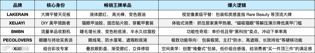 彩妆:以“专业级大众品牌”为核心,e.l.f.、NYX、Maybelline提供丰富色号、性价比高、快速响应潮流,满足日常通勤与创意妆容需求。