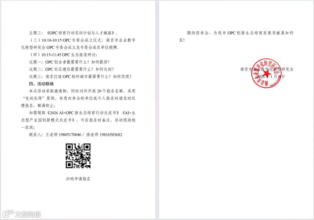 为及时总结、提升和促进“OPC社区”高质量、可持续发展,南京市企业数字化转型研究会在市相关部门指导支持下,于2016年1月15日上午举办“南京市OPC创新生态高质量发展研讨会”。诚邀市相关单位、各OPC社区负责人,以及OPC创业者代表等出席会议。具体事宜如下: