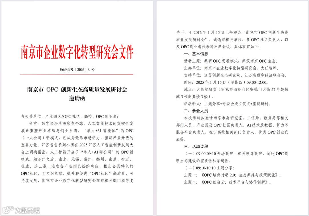 本次活动拟邀请南京市委研究室、工信局、数据局等相关部门人员,产业园及OPC社区负责人,AI技术及数据、算力等服务平台负责人,在宁高校相关部门负责人,优秀OPC创业代表等。