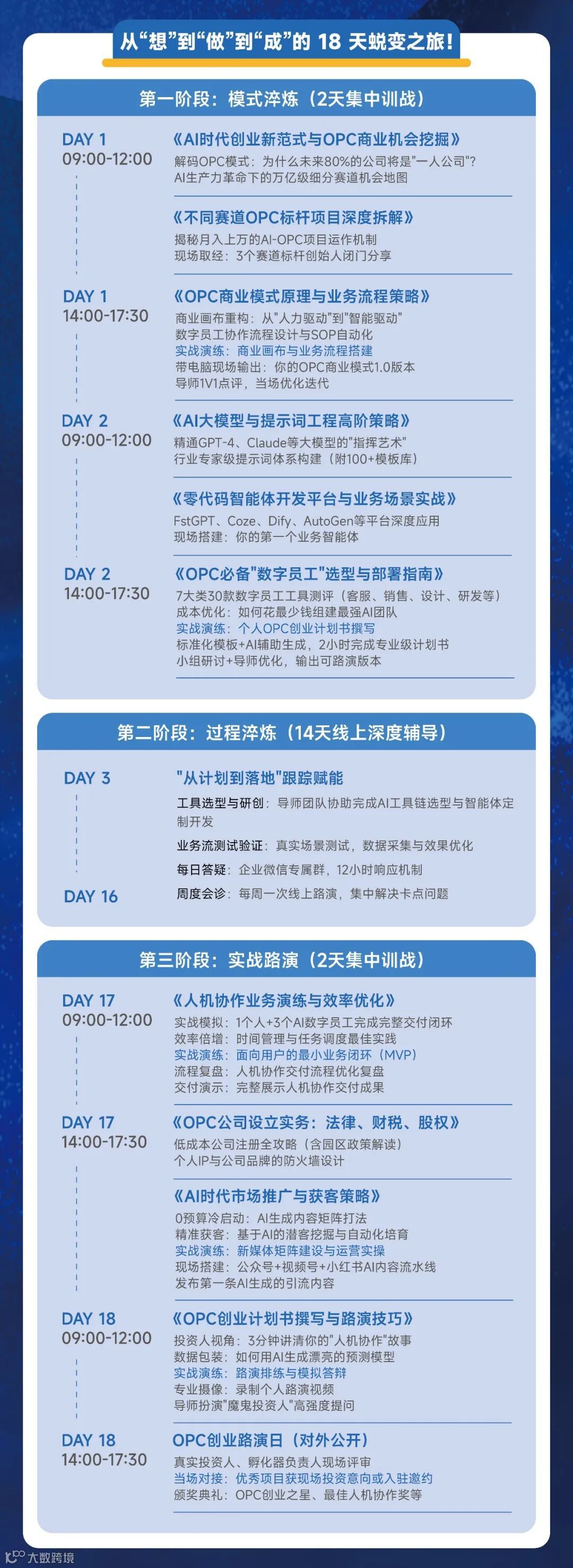 学员将在四周内,完成从商业定位、AI工作流搭建、产品化设计到获客交付的完整闭环,并产出属于自己的《个人OPC商业定位报告》与产品方案。