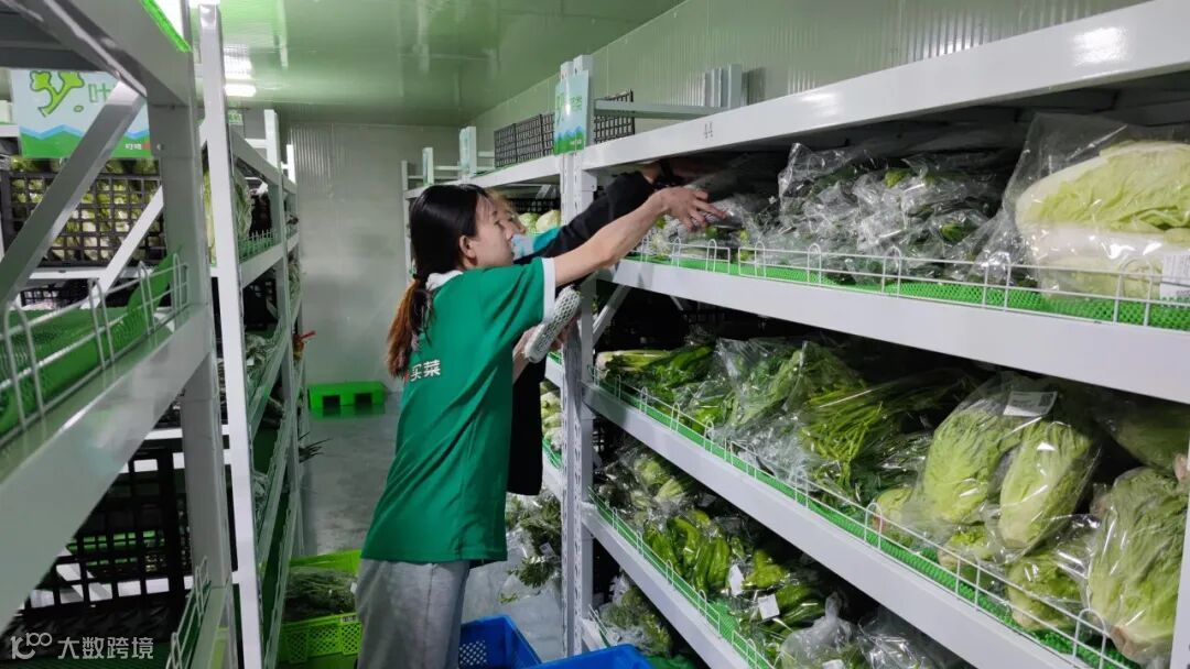 ▲叮咚买菜工作人员正在货架上查看菜品