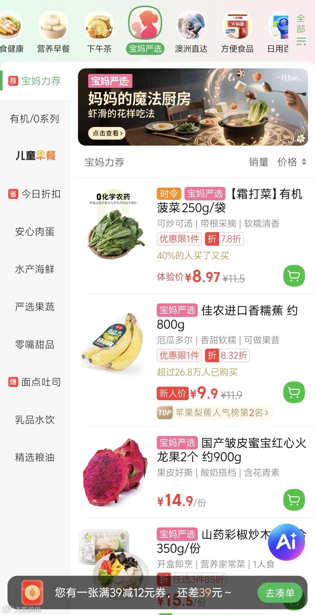 ▲叮咚买菜App里的“宝妈严选”分区