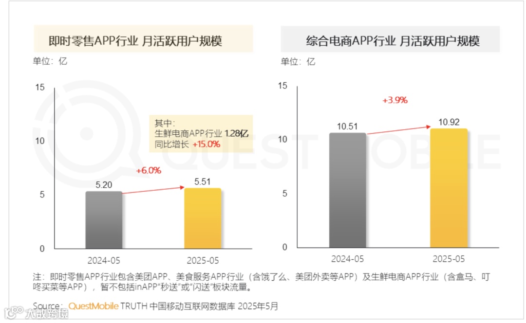 数据显示,一线城市即时零售渗透率约50%,下沉市场仅为10%,增长空间巨大。QuestMobile数据显示,2025年5月生鲜电商APP月活同比增长15%,达1.28亿。