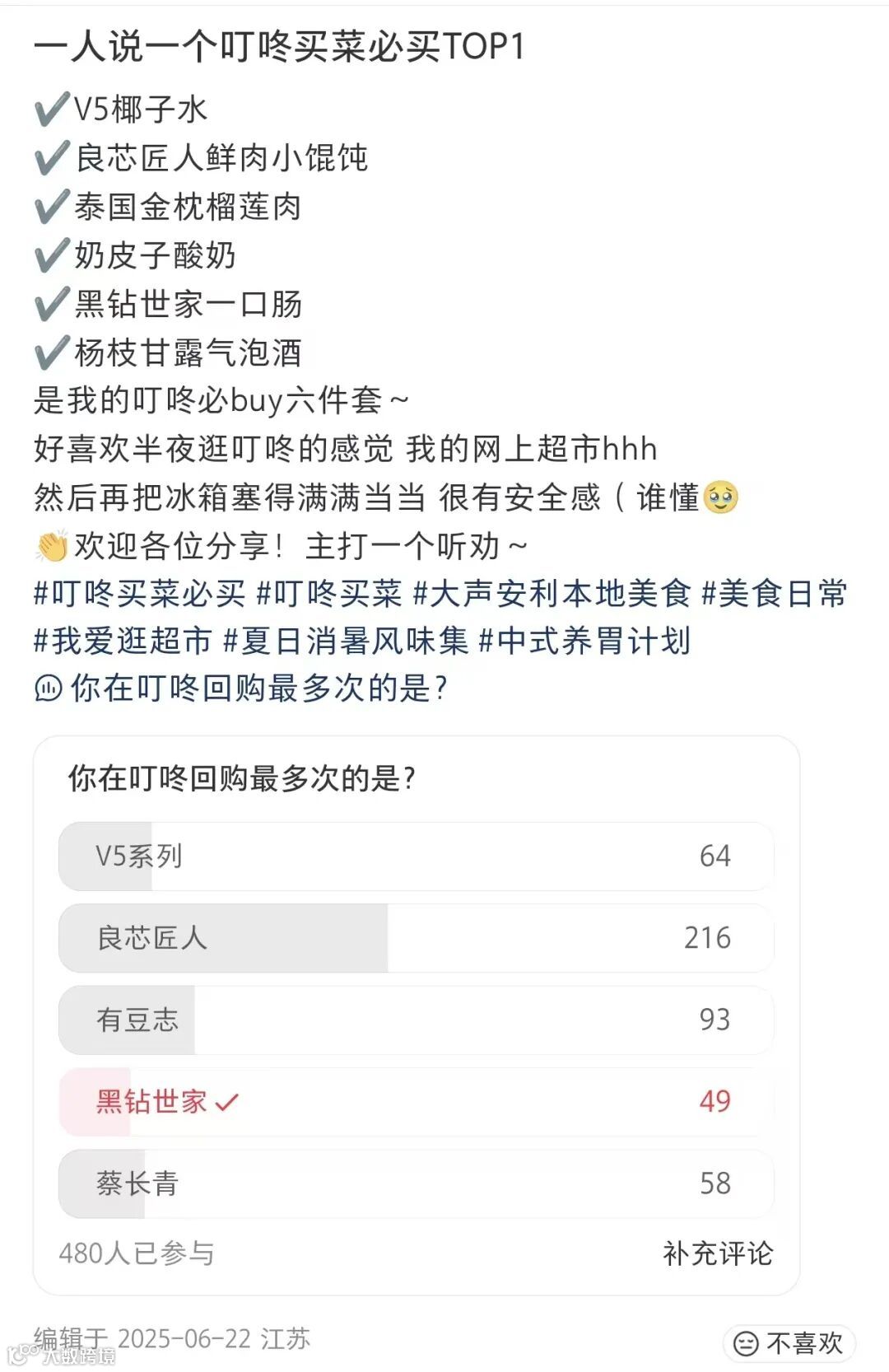 ▲社交媒体上网友们投票的叮咚买菜必买榜单