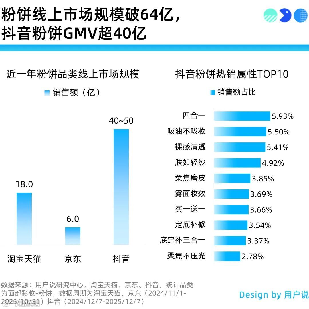 用户说数据显示,近一年粉饼线上市场规模已突破64亿,其中抖音遥遥领先,粉饼GMV已超40亿。在抖音粉饼市场中,“四合一”“吸油不吸妆”“裸感清透”三个关键词是消费者最为关注的属性,可见当前市场对粉饼的要求逐渐提升,要求既能做到定妆、补妆的基本功能,又要满足控油、清透等功效要求。