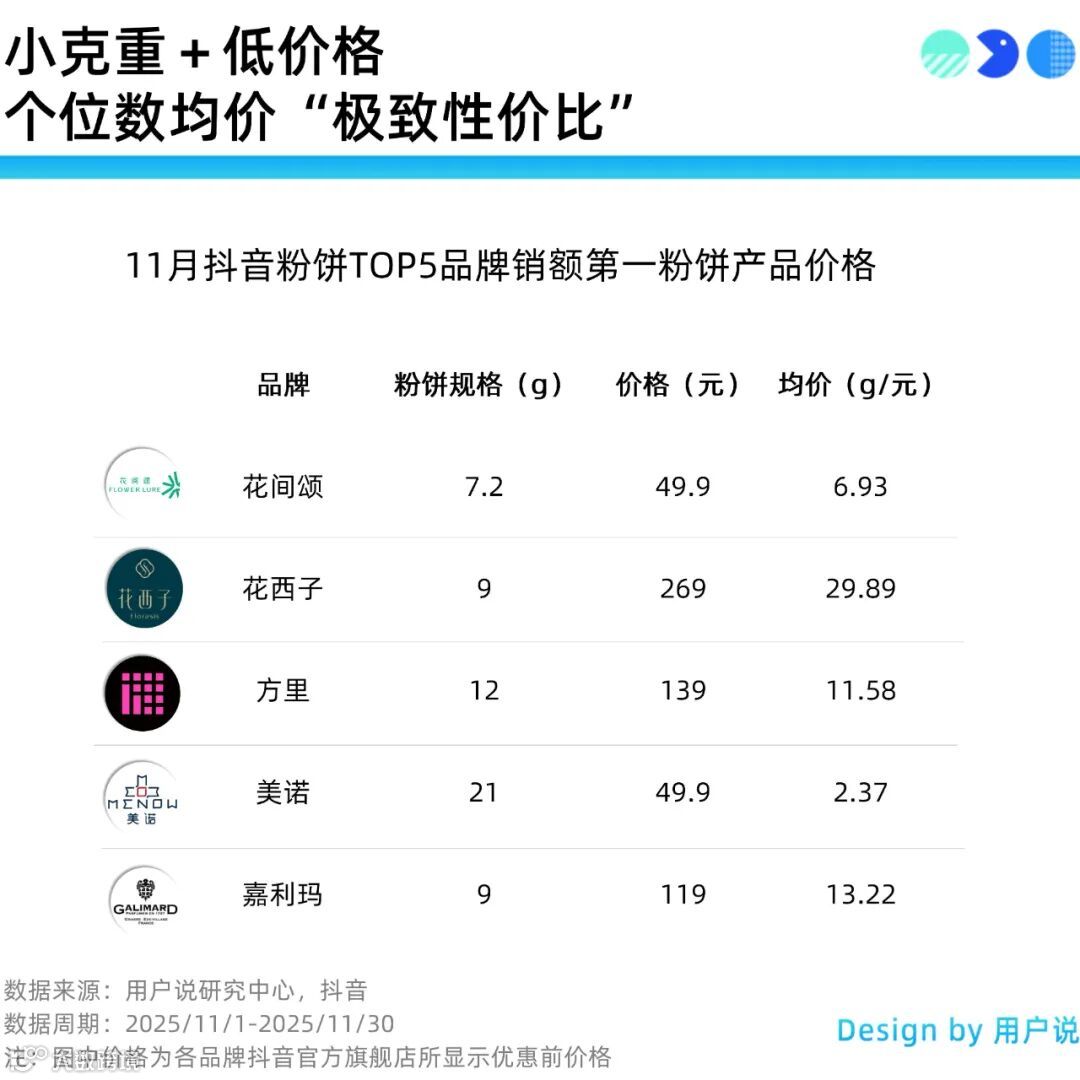 据用户说观察,少克重也是花间颂的市场策略之一。11月的抖音粉饼TOP5榜单分别由花间颂、花西子、方里、美诺、嘉利玛占领,而这5个品牌的销量第一的粉饼产品正装克重分别为7.2g、9g、12g、21g、9g,花间颂显著低于其他四个品牌。