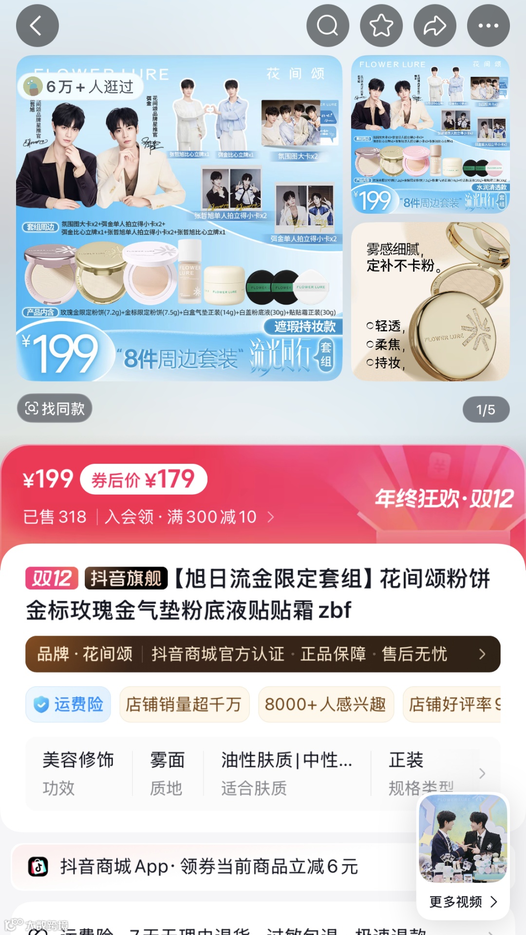 在艺人即时流量的承接上,花间颂表现出成熟的运营能力。首先是周边的配置:针对每一个合作艺人,花间颂会推出相应的艺人周边,例如小卡、拍立得、贴纸等,在对应的店铺购买对应的产品即可获得,同时也会推出艺人专属周边礼盒套装,极大地拉动了品牌的销量。以最新的「旭日流金限定套组」为例,该套组于12月7日9:00上架,截至12月8日12:00在抖音「花间颂官方旗舰店」便显示已售317件。