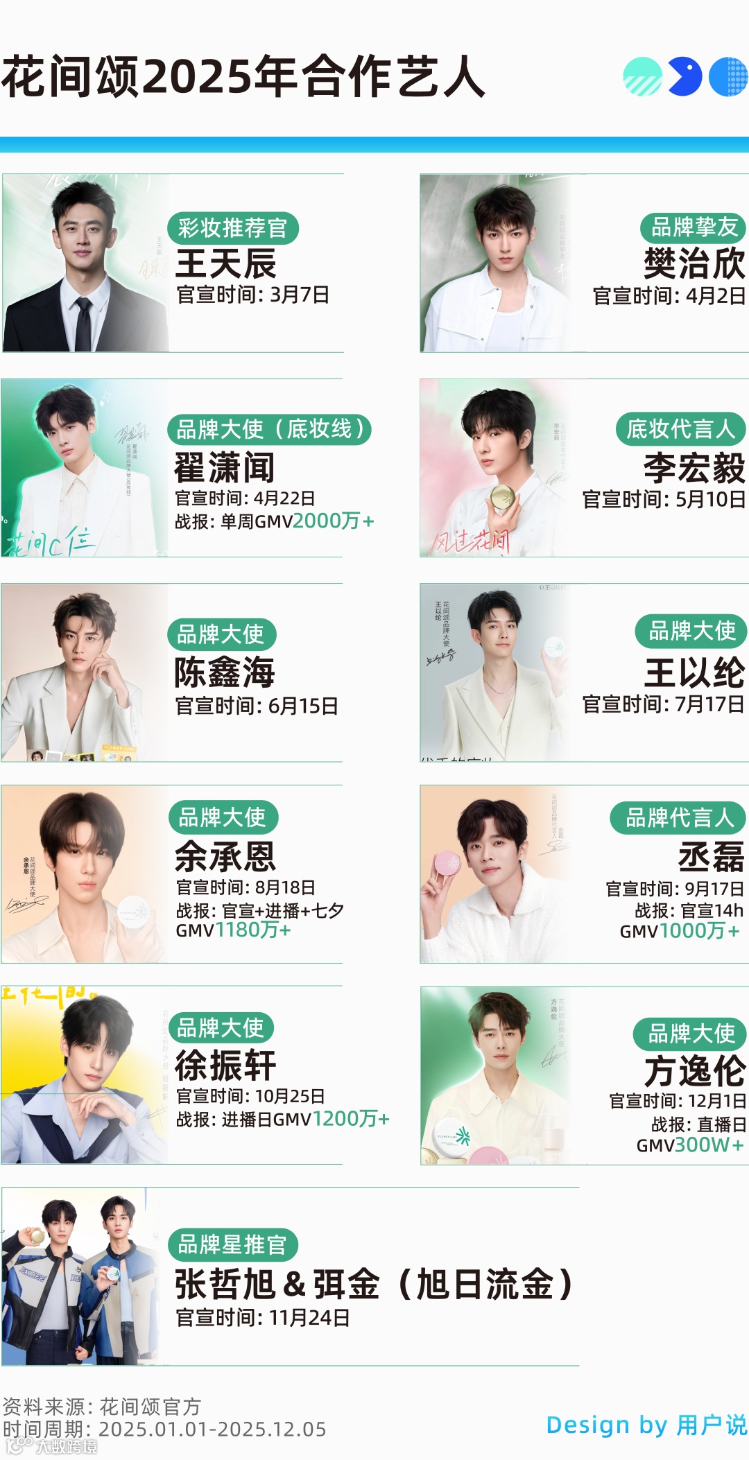 同样是与明星合作,比起其他品牌“盯紧”一个人的操作,花间颂投向了代言人矩阵的构建:从今年3月起至今,9个月的时间里花间颂连续官宣了11个合作艺人,平均每个月1-2位,合作title包括品牌代言人、品牌大使、品牌挚友等。